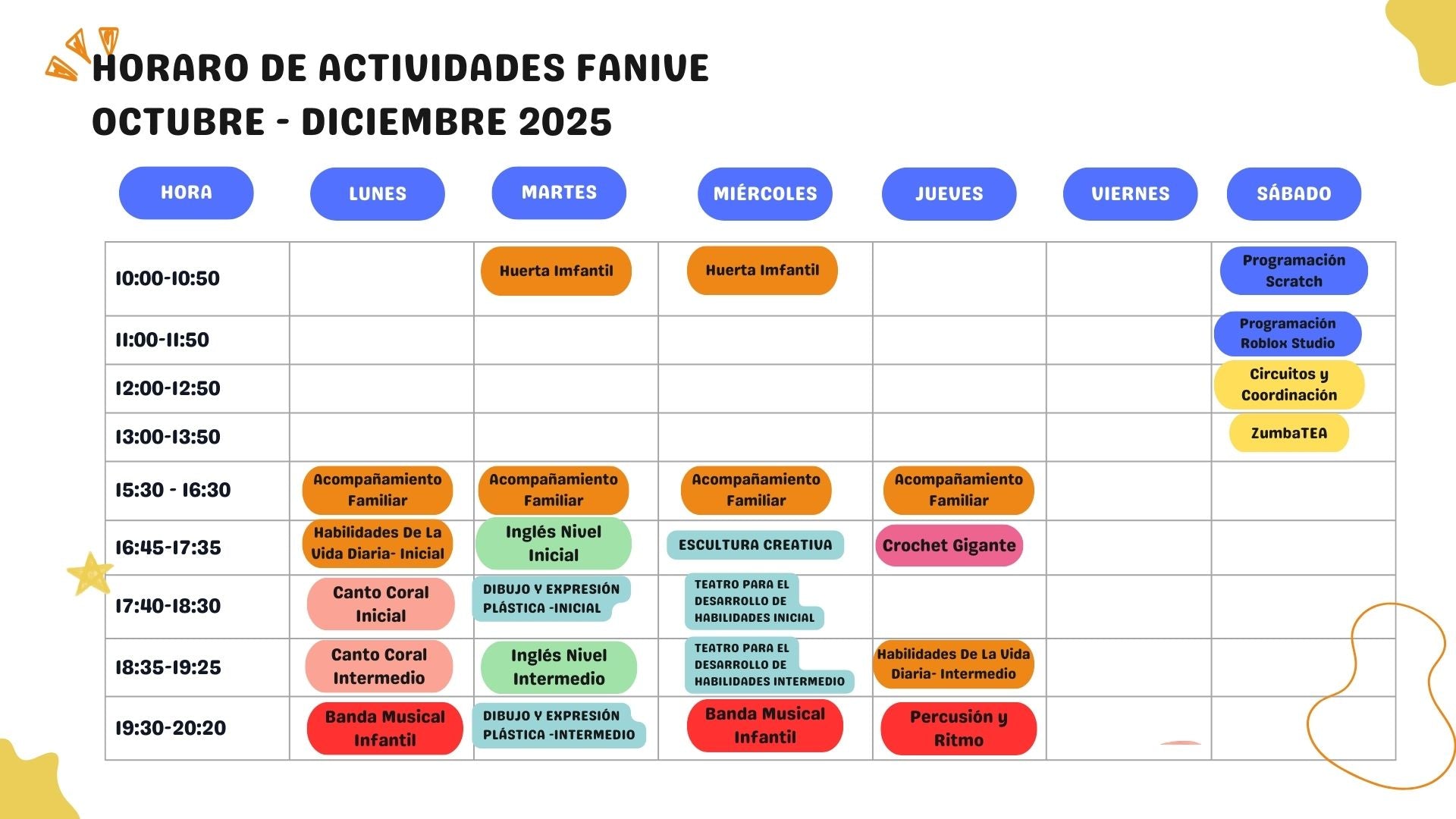 En FANIVE creemos que cada niño y joven merece un espacio donde brillar. Por eso, ofrecemos actividades inclusivas diseñadas para todas las capacidades: música, arte, movimiento, idiomas, tecnología y mucho más.